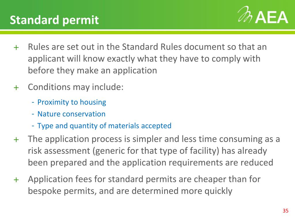 Standard permit • Rules are set out in the Standard Rules document so that an applicant will know exactly what they have to comply with before they make an application • Conditions may include: • Proximity to housing • Nature conservation • Type and quantity of materials accepted • The application process is simpler and less time consuming as a risk assessment (generic for that type of facility) has already been prepared and the application requirements are reduced • Application fees for standard permits are cheaper than for bespoke permits, and are determined more quickly