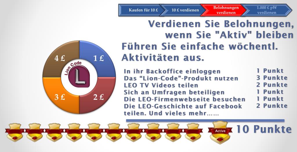 Verdienen Sie Belohnungen, wenn Sie "Aktiv" bleiben FührenSieeinfachewöchentl. Aktivitätenaus. 1 Punkt 3 Punkte 2 Punkte 1 Punkt 1 Punkt 2 Punkte In ihrBackofficeeinloggen Das “Lion-Code”-Produktnutzen LEO TV Videos teilen Sich an Umfragenbeteiligen Die LEO-Firmenwebseitebesuchen Die LEO-Geschichte auf Facebook teilen. Und vielesmehr…… 10 Punkte