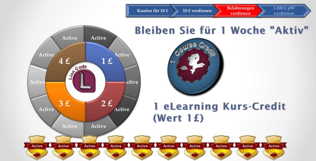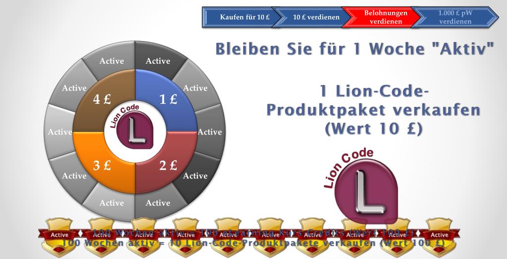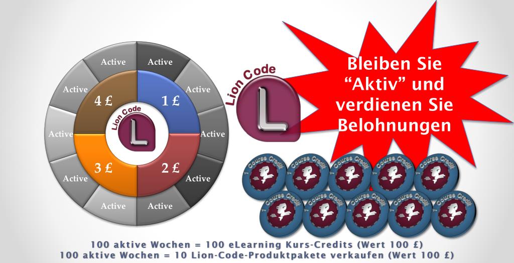 Bleiben Sie für 1 Woche "Aktiv" 1 Lion-Code-Produktpaketverkaufen (Wert 10 £) 100 Wochen aktiv = 100 eLearning Kurs-Credits (Wert 100 £) 100 Wochen aktiv = 10 Lion-Code-Produktpakete verkaufen (Wert 100 £)