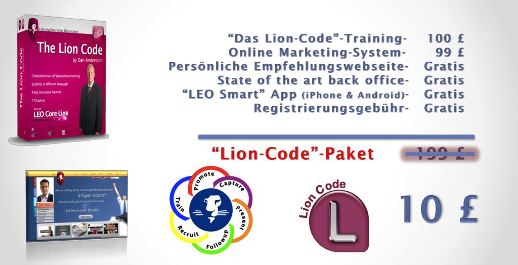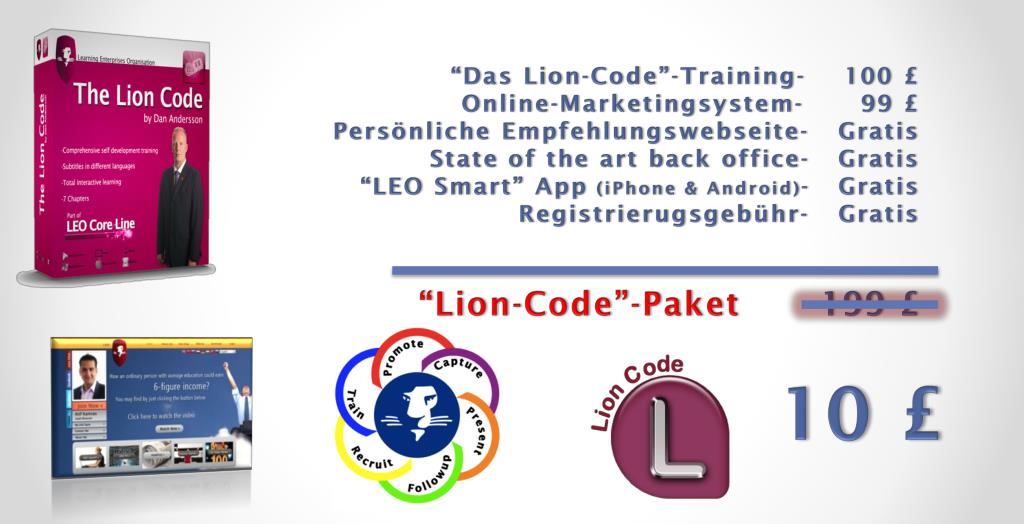 “Das Lion-Code”-Training- 100 £ Online-Marketingsystem- 99 £ PersönlicheEmpfehlungswebseite- Gratis State of the art back office- Gratis “LEO Smart” App(iPhone & Android)- Gratis Registrierugsgebühr- Gratis “Lion-Code”-Paket 199 £ 10 £
