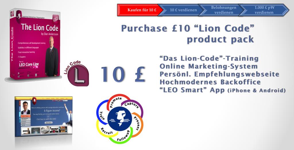 Purchase £10 “Lion Code” product pack “Das Lion-Code”-Training Online Marketing-System Persönl. Empfehlungswebseite HochmodernesBackoffice “LEO Smart” App(iPhone & Android) 10 £