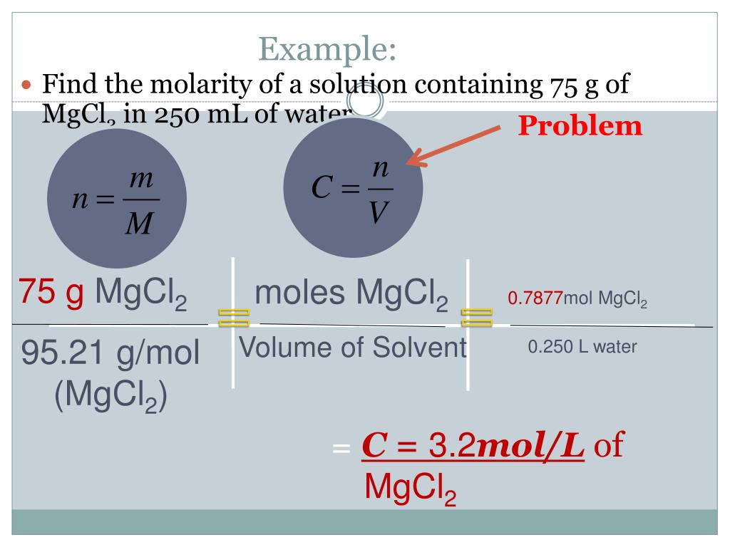 Example: Find the molarity of a solution containing 75 g of MgCl2 in 250 mL of water. Problem 75 g MgCl2 moles MgCl2 0.7877mol MgCl2 = = Volume of Solvent 95.21 g/mol (MgCl2) 0.250 L water = C = 3.2mol/L of MgCl2