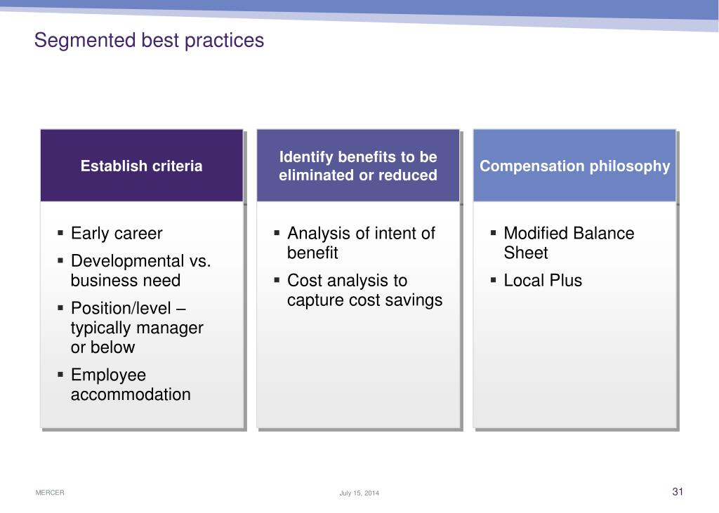 Segmented best practices Establish criteria Identify benefits to be eliminated or reduced Compensation philosophy • Early career • Developmental vs. business need • Position/level – typically manager or below • Employee accommodation • Analysis of intent of benefit • Cost analysis to capture cost savings • Modified Balance Sheet • Local Plus