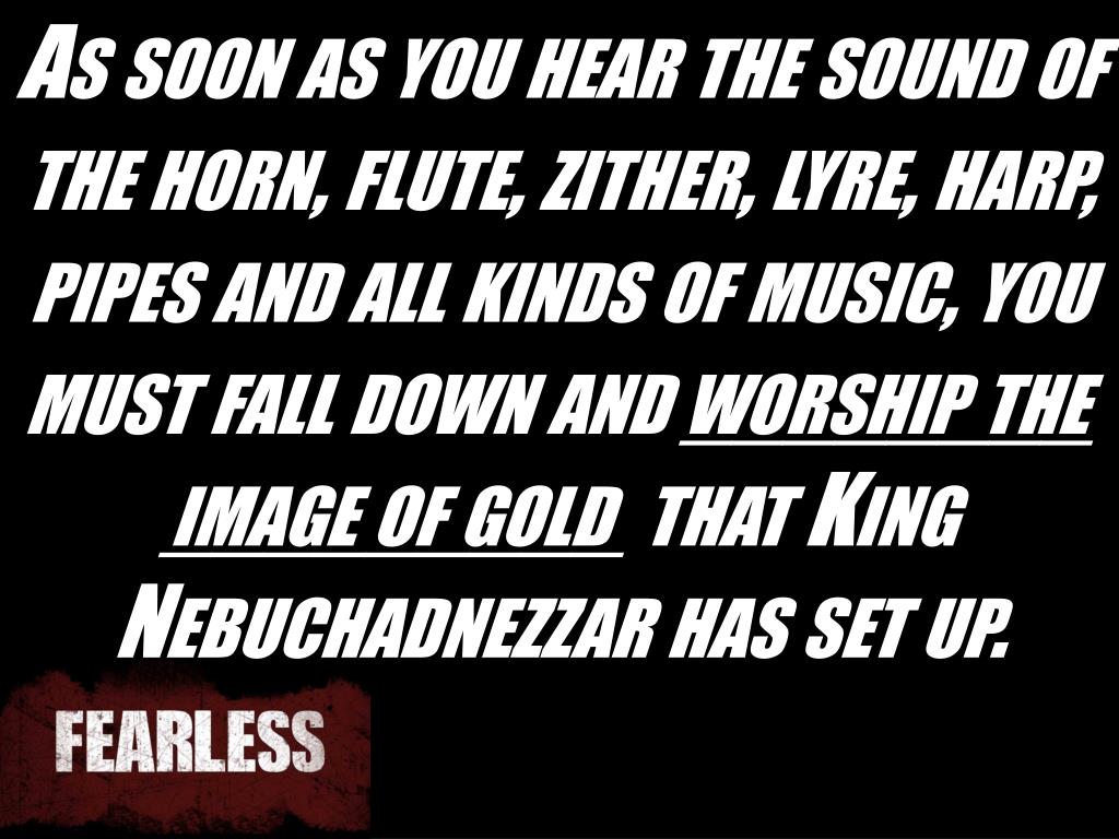 As soon as you hear the sound of the horn, flute, zither, lyre, harp, pipes and all kinds of music, you must fall down and ________ _________ that King Nebuchadnezzar has set up. worship the image of gold