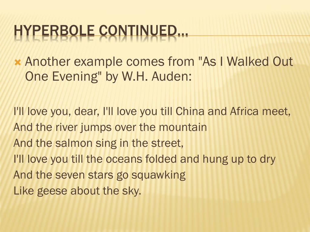 Another example comes from "As I Walked Out One Evening" by W.H. Auden: I'll love you, dear, I'll love you till China and Africa meet, And the river jumps over the mountain And the salmon sing in the street, I'll love you till the oceans folded and hung up to dry And the seven stars go squawking Like geese about the sky. Hyperbole continued…