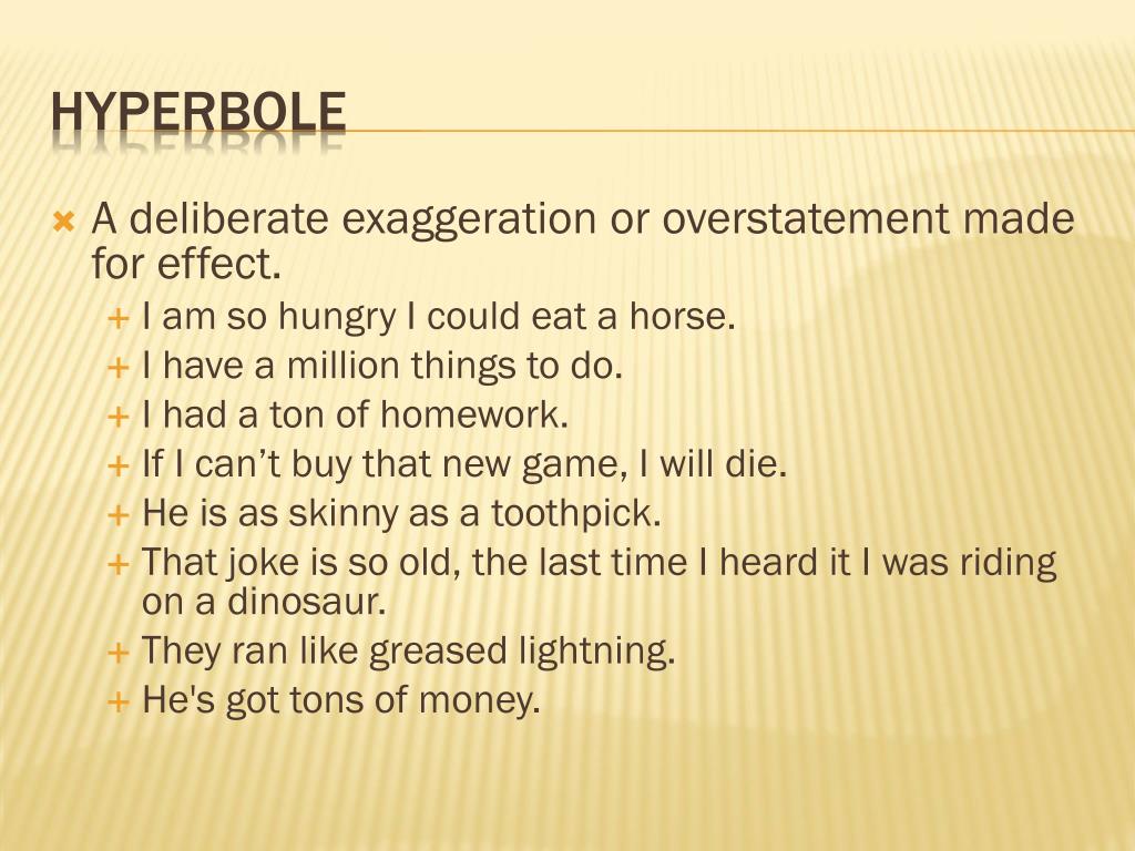 A deliberate exaggeration or overstatement made for effect. • I am so hungry I could eat a horse. • I have a million things to do. • I had a ton of homework. • If I can’t buy that new game, I will die. • He is as skinny as a toothpick. • That joke is so old, the last time I heard it I was riding on a dinosaur. • They ran like greased lightning. • He's got tons of money. hyperbole