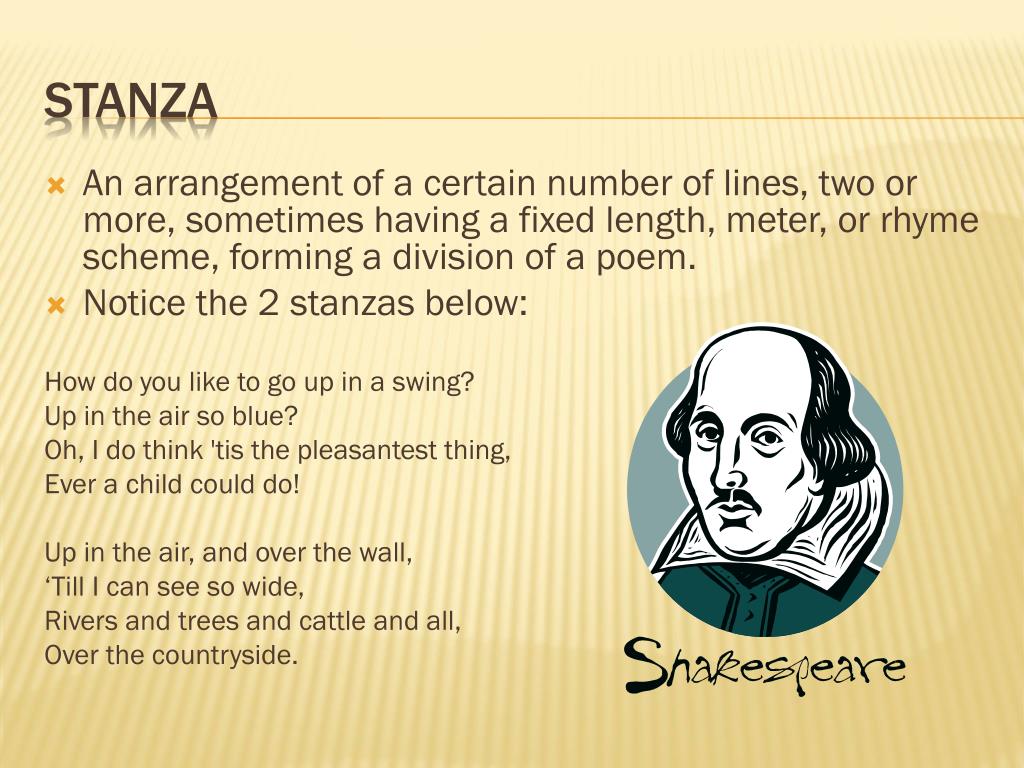 An arrangement of a certain number of lines, two or more, sometimes having a fixed length, meter, or rhyme scheme, forming a division of a poem. Notice the 2 stanzas below: How do you like to go up in a swing? Up in the air so blue? Oh, I do think 'tis the pleasantest thing, Ever a child could do! Up in the air, and over the wall, ‘Till I can see so wide, Rivers and trees and cattle and all, Over the countryside. Stanza