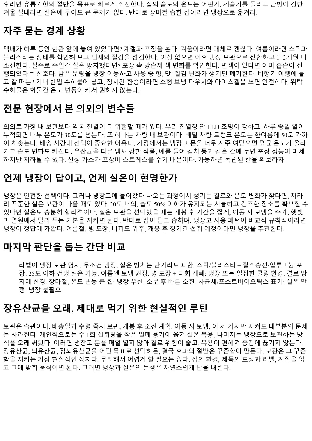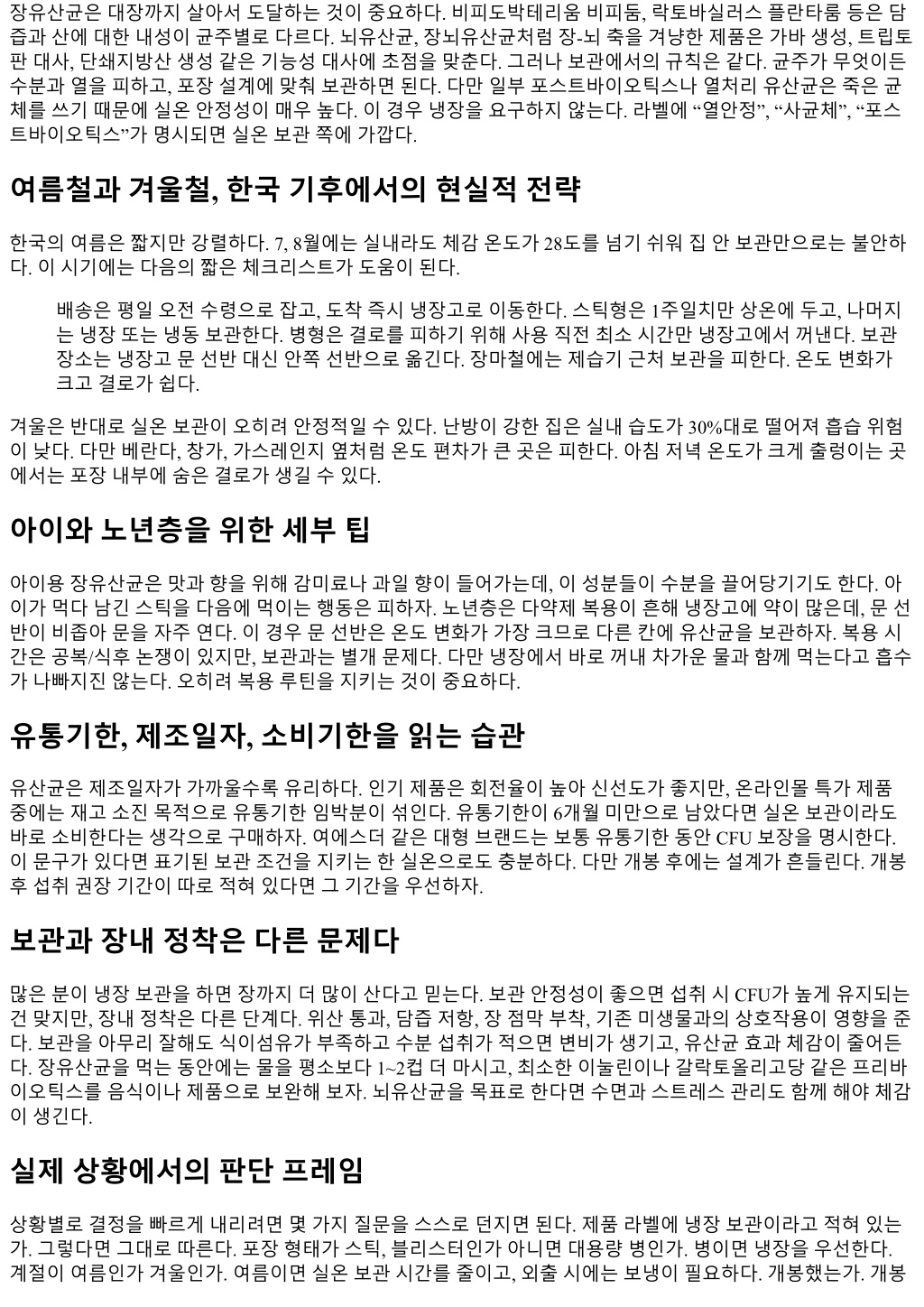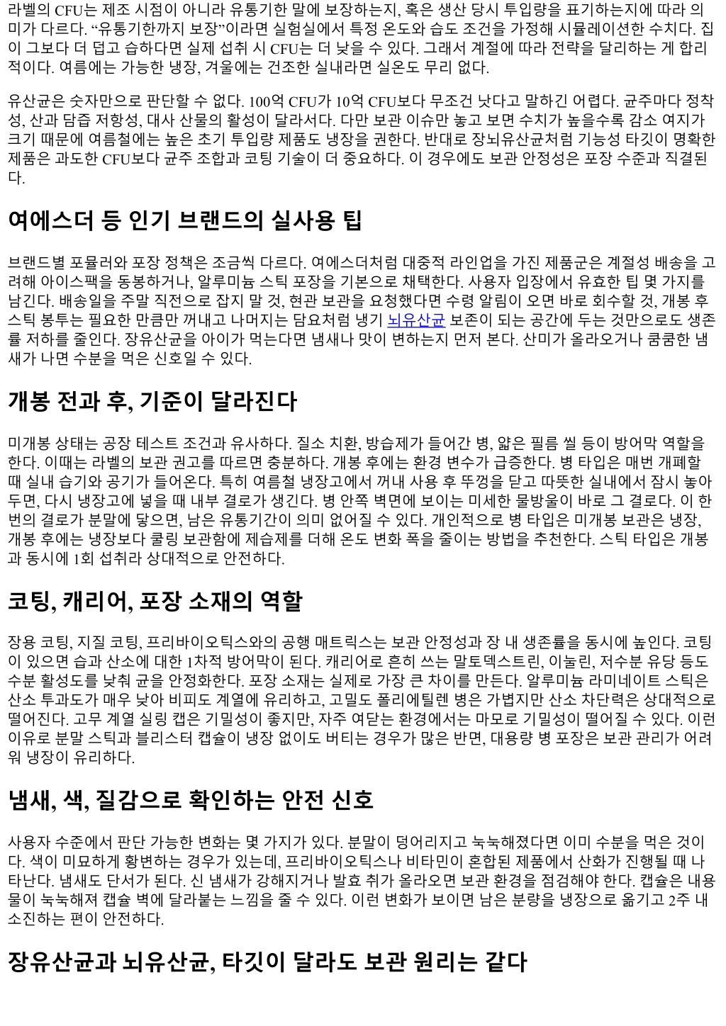 장유산균은대장까지살아서도달하는것이중요하다. 비피도박테리움비피둠, 락토바실러스플란타룸등은담 즙과산에대한내성이균주별로다르다. 뇌유산균, 장뇌유산균처럼장-뇌축을겨냥한제품은가바생성, 트립토 판대사, 단쇄지방산생성같은기능성대사에초점을맞춘다. 그러나보관에서의규칙은같다. 균주가무엇이든 수분과열을피하고, 포장설계에맞춰보관하면된다. 다만일부포스트바이오틱스나열처리유산균은죽은균 체를쓰기때문에실온안정성이매우높다. 이경우냉장을요구하지않는다. 라벨에 “열안정”, “사균체”, “포스 트바이오틱스”가명시되면실온보관쪽에가깝다. 여름철과겨울철, 한국기후에서의현실적전략 한국의여름은짧지만강렬하다. 7, 8월에는실내라도체감온도가 28도를넘기쉬워집안보관만으로는불안하 다. 이시기에는다음의짧은체크리스트가도움이된다. 배송은평일오전수령으로잡고, 도착즉시냉장고로이동한다. 스틱형은 1주일치만상온에두고, 나머지 는냉장또는냉동보관한다. 병형은결로를피하기위해사용직전최소시간만냉장고에서꺼낸다. 보관 장소는냉장고문선반대신안쪽선반으로옮긴다. 장마철에는제습기근처보관을피한다. 온도변화가 크고결로가쉽다. 겨울은반대로실온보관이오히려안정적일수있다. 난방이강한집은실내습도가 30%대로떨어져흡습위험 이낮다. 다만베란다, 창가, 가스레인지옆처럼온도편차가큰곳은피한다. 아침저녁온도가크게출렁이는곳 에서는포장내부에숨은결로가생길수있다. 아이와노년층을위한세부팁 아이용장유산균은맛과향을위해감미료나과일향이들어가는데, 이성분들이수분을끌어당기기도한다. 아 이가먹다남긴스틱을다음에먹이는행동은피하자. 노년층은다약제복용이흔해냉장고에약이많은데, 문선 반이비좁아문을자주연다. 이경우문선반은온도변화가가장크므로다른칸에유산균을보관하자. 복용시 간은공복/식후논쟁이있지만, 보관과는별개문제다. 다만냉장에서바로꺼내차가운물과함께먹는다고흡수 가나빠지진않는다. 오히려복용루틴을지키는것이중요하다. 유통기한, 제조일자, 소비기한을읽는습관 유산균은제조일자가가까울수록유리하다. 인기제품은회전율이높아신선도가좋지만, 온라인몰특가제품 중에는재고소진목적으로유통기한임박분이섞인다. 유통기한이 6개월미만으로남았다면실온보관이라도 바로소비한다는생각으로구매하자. 여에스더같은대형브랜드는보통유통기한동안 CFU 보장을명시한다. 이문구가있다면표기된보관조건을지키는한실온으로도충분하다. 다만개봉후에는설계가흔들린다. 개봉 후섭취권장기간이따로적혀있다면그기간을우선하자. 보관과장내정착은다른문제다 많은분이냉장보관을하면장까지더많이산다고믿는다. 보관안정성이좋으면섭취시 CFU가높게유지되는 건맞지만, 장내정착은다른단계다. 위산통과, 담즙저항, 장점막부착, 기존미생물과의상호작용이영향을준 다. 보관을아무리잘해도식이섬유가부족하고수분섭취가적으면변비가생기고, 유산균효과체감이줄어든 다. 장유산균을먹는동안에는물을평소보다 1~2컵더마시고, 최소한이눌린이나갈락토올리고당같은프리바 이오틱스를음식이나제품으로보완해보자. 뇌유산균을목표로한다면수면과스트레스관리도함께해야체감 이생긴다. 실제상황에서의판단프레임 상황별로결정을빠르게내리려면몇가지질문을스스로던지면된다. 제품라벨에냉장보관이라고적혀있는 가. 그렇다면그대로따른다. 포장형태가스틱, 블리스터인가아니면대용량병인가. 병이면냉장을우선한다. 계절이여름인가겨울인가. 여름이면실온보관시간를줄이고, 외출시에는보냉이필요하다. 개봉했는가. 개봉