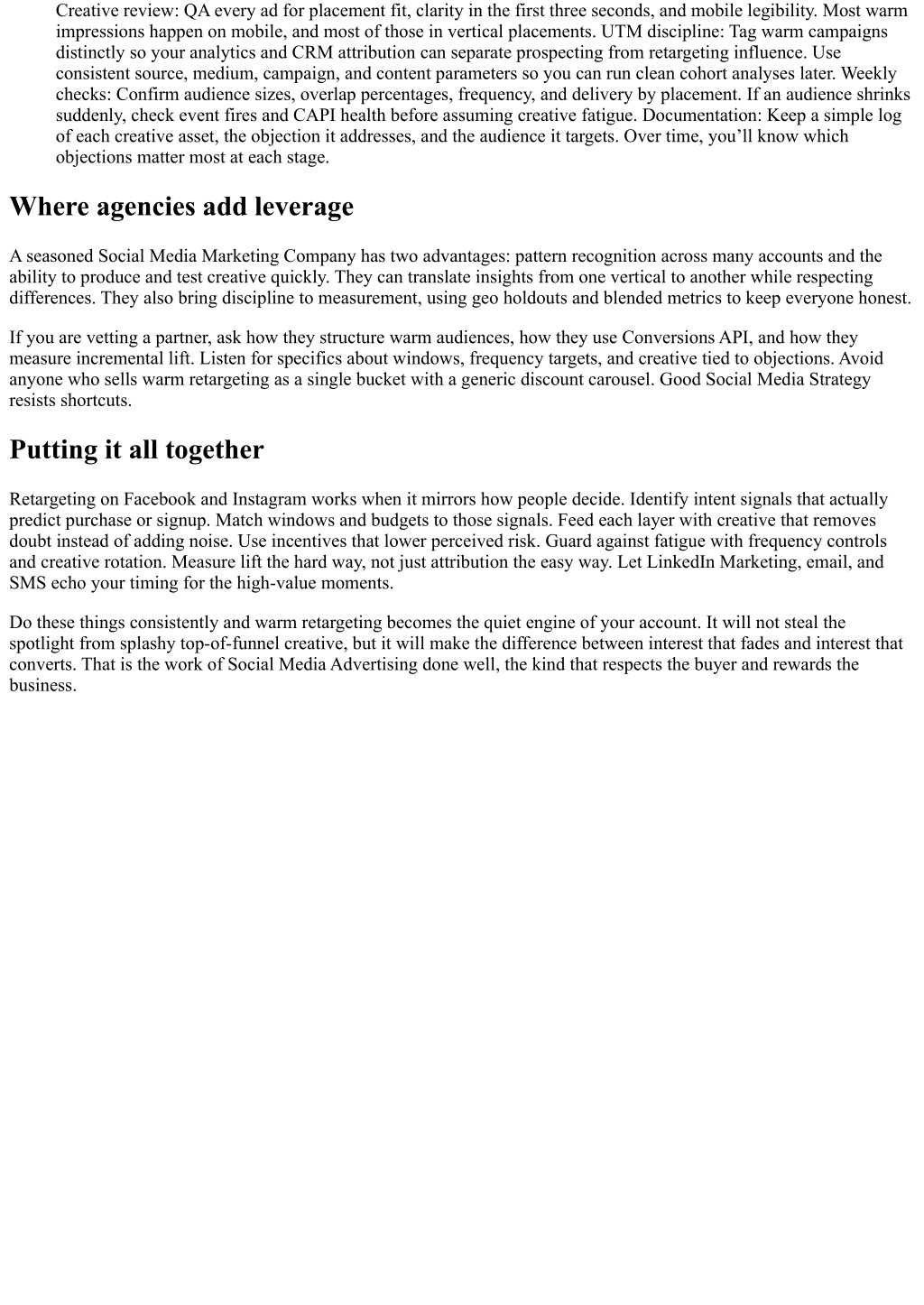Creative review: QA every ad for placement fit, clarity in the first three seconds, and mobile legibility. Most warm impressions happen on mobile, and most of those in vertical placements. UTM discipline: Tag warm campaigns distinctly so your analytics and CRM attribution can separate prospecting from retargeting influence. Use consistent source, medium, campaign, and content parameters so you can run clean cohort analyses later. Weekly checks: Confirm audience sizes, overlap percentages, frequency, and delivery by placement. If an audience shrinks suddenly, check event fires and CAPI health before assuming creative fatigue. Documentation: Keep a simple log of each creative asset, the objection it addresses, and the audience it targets. Over time, you’ll know which objections matter most at each stage. Where agencies add leverage A seasoned Social Media Marketing Company has two advantages: pattern recognition across many accounts and the ability to produce and test creative quickly. They can translate insights from one vertical to another while respecting differences. They also bring discipline to measurement, using geo holdouts and blended metrics to keep everyone honest. If you are vetting a partner, ask how they structure warm audiences, how they use Conversions API, and how they measure incremental lift. Listen for specifics about windows, frequency targets, and creative tied to objections. Avoid anyone who sells warm retargeting as a single bucket with a generic discount carousel. Good Social Media Strategy resists shortcuts. Putting it all together Retargeting on Facebook and Instagram works when it mirrors how people decide. Identify intent signals that actually predict purchase or signup. Match windows and budgets to those signals. Feed each layer with creative that removes doubt instead of adding noise. Use incentives that lower perceived risk. Guard against fatigue with frequency controls and creative rotation. Measure lift the hard way, not just attribution the easy way. Let LinkedIn Marketing, email, and SMS echo your timing for the high-value moments. Do these things consistently and warm retargeting becomes the quiet engine of your account. It will not steal the spotlight from splashy top-of-funnel creative, but it will make the difference between interest that fades and interest that converts. That is the work of Social Media Advertising done well, the kind that respects the buyer and rewards the business.