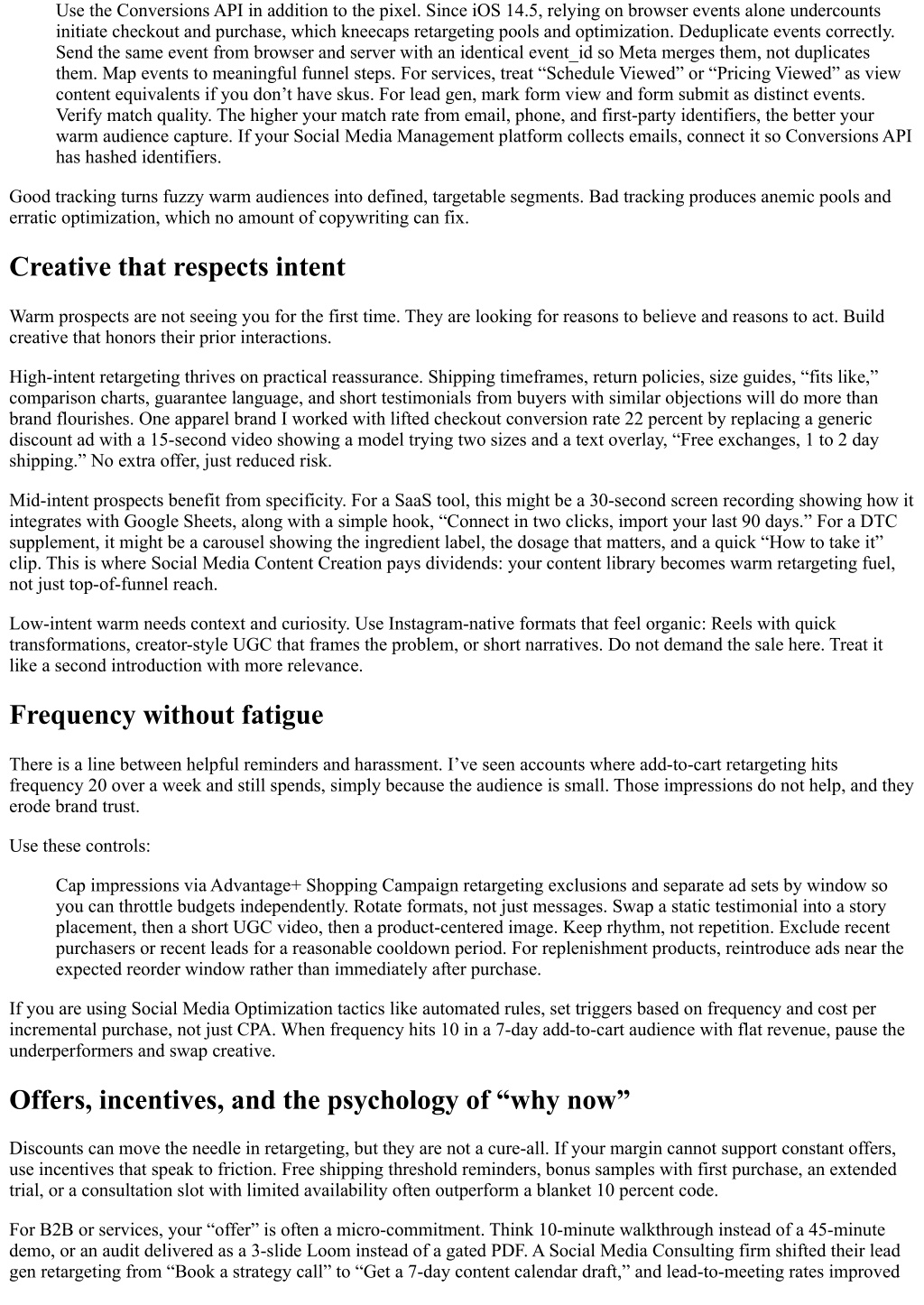 Use the Conversions API in addition to the pixel. Since iOS 14.5, relying on browser events alone undercounts initiate checkout and purchase, which kneecaps retargeting pools and optimization. Deduplicate events correctly. Send the same event from browser and server with an identical event_id so Meta merges them, not duplicates them. Map events to meaningful funnel steps. For services, treat “Schedule Viewed” or “Pricing Viewed” as view content equivalents if you don’t have skus. For lead gen, mark form view and form submit as distinct events. Verify match quality. The higher your match rate from email, phone, and first-party identifiers, the better your warm audience capture. If your Social Media Management platform collects emails, connect it so Conversions API has hashed identifiers. Good tracking turns fuzzy warm audiences into defined, targetable segments. Bad tracking produces anemic pools and erratic optimization, which no amount of copywriting can fix. Creative that respects intent Warm prospects are not seeing you for the first time. They are looking for reasons to believe and reasons to act. Build creative that honors their prior interactions. High-intent retargeting thrives on practical reassurance. Shipping timeframes, return policies, size guides, “fits like,” comparison charts, guarantee language, and short testimonials from buyers with similar objections will do more than brand flourishes. One apparel brand I worked with lifted checkout conversion rate 22 percent by replacing a generic discount ad with a 15-second video showing a model trying two sizes and a text overlay, “Free exchanges, 1 to 2 day shipping.” No extra offer, just reduced risk. Mid-intent prospects benefit from specificity. For a SaaS tool, this might be a 30-second screen recording showing how it integrates with Google Sheets, along with a simple hook, “Connect in two clicks, import your last 90 days.” For a DTC supplement, it might be a carousel showing the ingredient label, the dosage that matters, and a quick “How to take it” clip. This is where Social Media Content Creation pays dividends: your content library becomes warm retargeting fuel, not just top-of-funnel reach. Low-intent warm needs context and curiosity. Use Instagram-native formats that feel organic: Reels with quick transformations, creator-style UGC that frames the problem, or short narratives. Do not demand the sale here. Treat it like a second introduction with more relevance. Frequency without fatigue There is a line between helpful reminders and harassment. I’ve seen accounts where add-to-cart retargeting hits frequency 20 over a week and still spends, simply because the audience is small. Those impressions do not help, and they erode brand trust. Use these controls: Cap impressions via Advantage+ Shopping Campaign retargeting exclusions and separate ad sets by window so you can throttle budgets independently. Rotate formats, not just messages. Swap a static testimonial into a story placement, then a short UGC video, then a product-centered image. Keep rhythm, not repetition. Exclude recent purchasers or recent leads for a reasonable cooldown period. For replenishment products, reintroduce ads near the expected reorder window rather than immediately after purchase. If you are using Social Media Optimization tactics like automated rules, set triggers based on frequency and cost per incremental purchase, not just CPA. When frequency hits 10 in a 7-day add-to-cart audience with flat revenue, pause the underperformers and swap creative. Offers, incentives, and the psychology of “why now” Discounts can move the needle in retargeting, but they are not a cure-all. If your margin cannot support constant offers, use incentives that speak to friction. Free shipping threshold reminders, bonus samples with first purchase, an extended trial, or a consultation slot with limited availability often outperform a blanket 10 percent code. For B2B or services, your “offer” is often a micro-commitment. Think 10-minute walkthrough instead of a 45-minute demo, or an audit delivered as a 3-slide Loom instead of a gated PDF. A Social Media Consulting firm shifted their lead gen retargeting from “Book a strategy call” to “Get a 7-day content calendar draft,” and lead-to-meeting rates improved