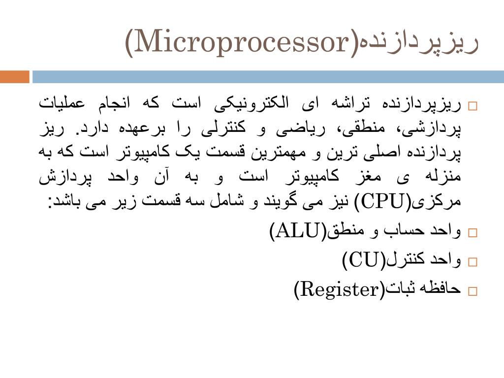 ریزپردازنده(Microprocessor) • ریزپردازنده تراشه ای الکترونیکی است که انجام عملیات پردازشی، منطقی، ریاضی و کنترلی را برعهده دارد. ریز پردازنده اصلی ترین و مهمترین قسمت یک کامپیوتر است که به منزله ی مغز کامپیوتر است و به آن واحد پردازش مرکزی(CPU) نیز می گویند و شامل سه قسمت زیر می باشد: • واحد حساب و منطق(ALU) • واحد کنترل(CU) • حافظه ثبات(Register)