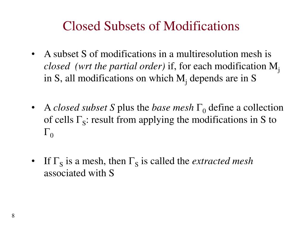 Closed Subsets of Modifications • A subset S of modifications in a multiresolution mesh is closed (wrt the partial order) if, for each modification Mj in S, all modifications on which Mj depends are in S • A closed subset S plus the base mesh G0 define a collection of cells GS: result from applying the modifications in S to G0 • If GS is a mesh, then GS is called the extracted mesh associated with S