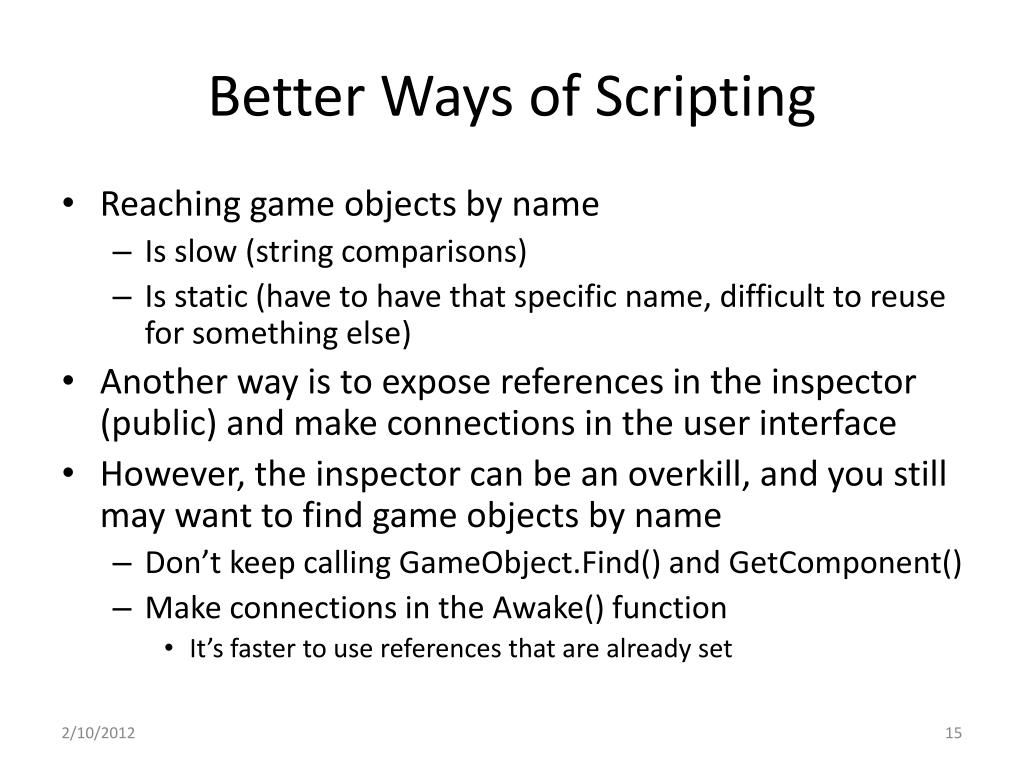 Better Ways of Scripting • Reaching game objects by name • Is slow (string comparisons) • Is static (have to have that specific name, difficult to reuse for something else) • Another way is to expose references in the inspector (public) and make connections in the user interface • However, the inspector can be an overkill, and you still may want to find game objects by name • Don’t keep calling GameObject.Find() and GetComponent() • Make connections in the Awake() function • It’s faster to use references that are already set