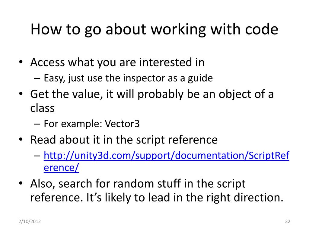How to go about working with code • Access what you are interested in • Easy, just use the inspector as a guide • Get the value, it will probably be an object of a class • For example: Vector3 • Read about it in the script reference • http://unity3d.com/support/documentation/ScriptReference/ • Also, search for random stuff in the script reference. It’s likely to lead in the right direction.