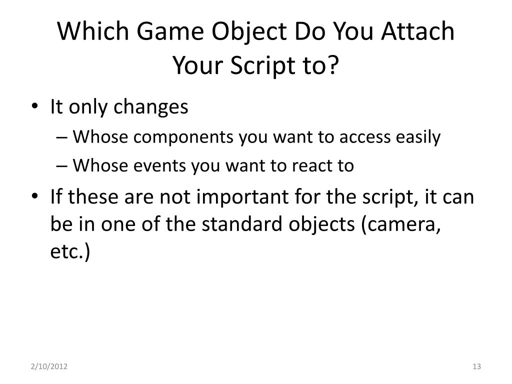 Which Game Object Do You Attach Your Script to? • It only changes • Whose components you want to access easily • Whose events you want to react to • If these are not important for the script, it can be in one of the standard objects (camera, etc.)