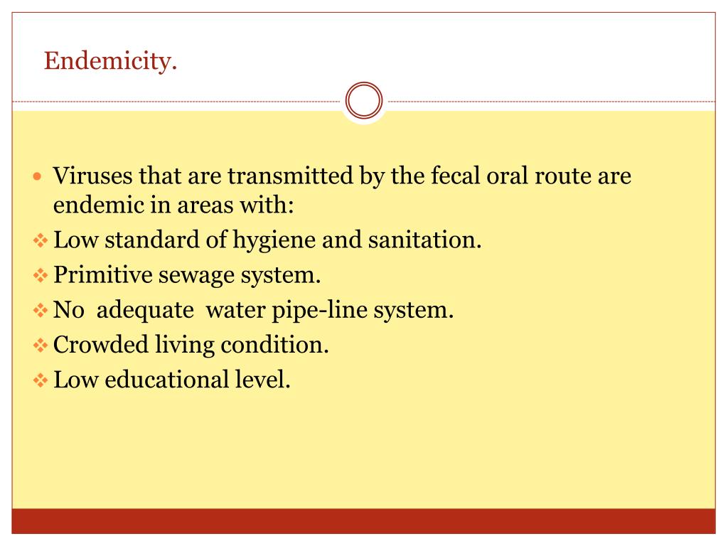 Endemicity. • Viruses that are transmitted by the fecal oral route are endemic in areas with: • Low standard of hygiene and sanitation. • Primitive sewage system. • No adequate water pipe-line system. • Crowded living condition. • Low educational level.