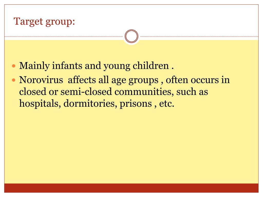 Target group: Mainly infants and young children . Norovirus affects all age groups , often occurs in closed or semi-closed communities, such as hospitals, dormitories, prisons , etc.