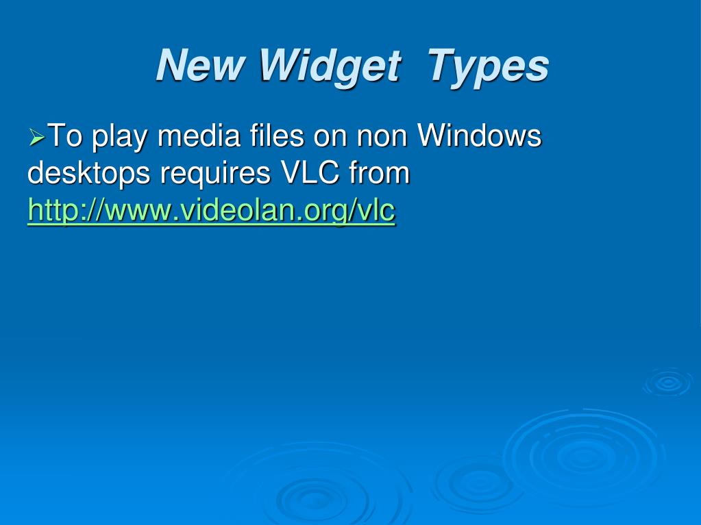 To play media files on non Windows desktops requires VLC from http://www.videolan.org/vlc New Widget Types