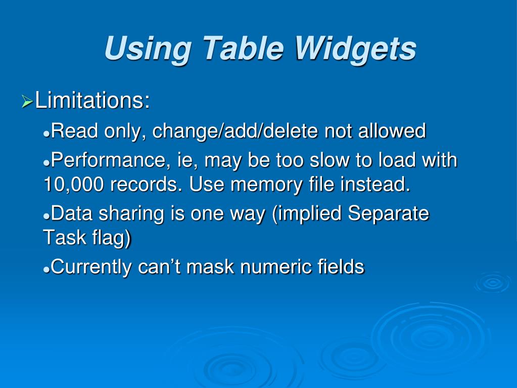 Limitations: Read only, change/add/delete not allowed Performance, ie, may be too slow to load with 10,000 records. Use memory file instead. Data sharing is one way (implied Separate Task flag) Currently can’t mask numeric fields Using Table Widgets