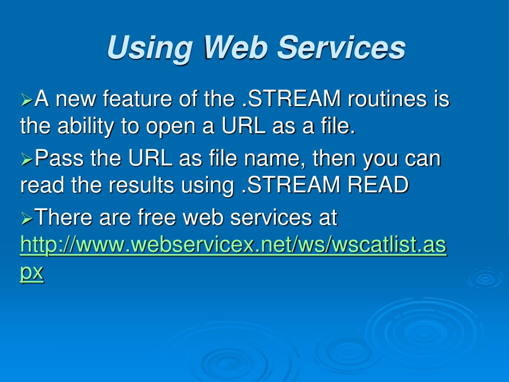 A new feature of the .STREAM routines is the ability to open a URL as a file. Pass the URL as file name, then you can read the results using .STREAM READ There are free web services at http://www.webservicex.net/ws/wscatlist.aspx Using Web Services