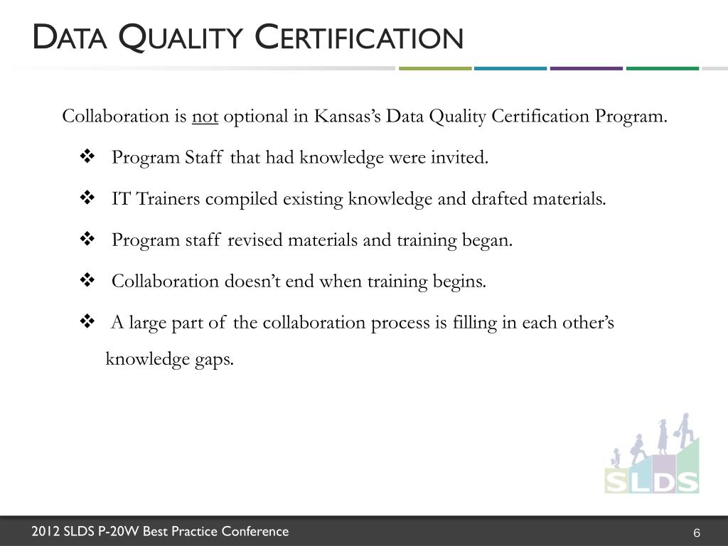 Data Quality Certification Collaboration is not optional in Kansas’s Data Quality Certification Program. Program Staff that had knowledge were invited. IT Trainers compiled existing knowledge and drafted materials. Program staff revised materials and training began. Collaboration doesn’t end when training begins. A large part of the collaboration process is filling in each other’s knowledge gaps.