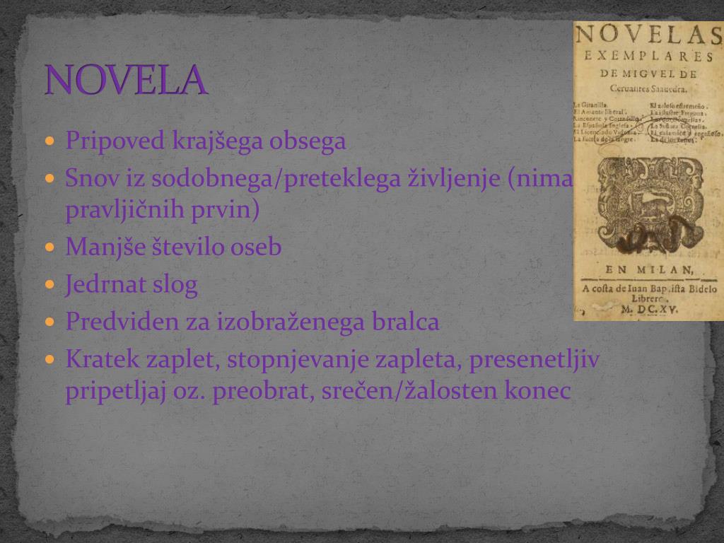 NOVELA • Pripoved krajšega obsega • Snov iz sodobnega/preteklega življenje (nima pravljičnih prvin) • Manjše število oseb • Jedrnat slog • Predviden za izobraženega bralca • Kratek zaplet, stopnjevanje zapleta, presenetljiv pripetljaj oz. preobrat, srečen/žalosten konec