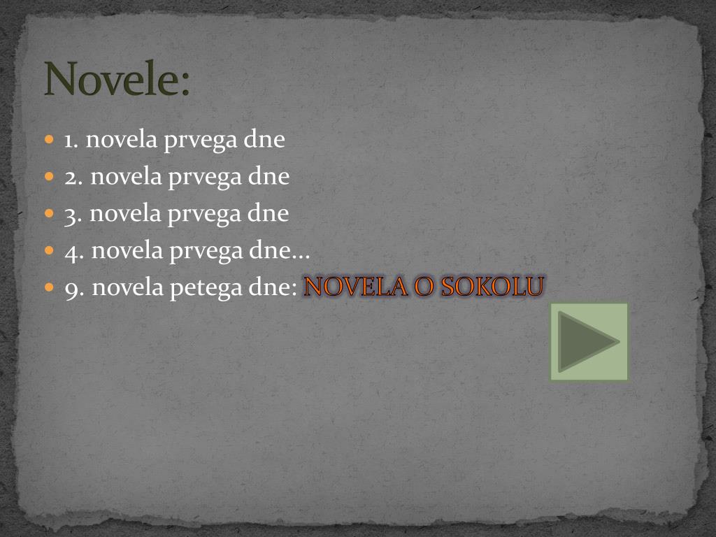 Novele: • 1. novela prvega dne • 2. novela prvega dne • 3. novela prvega dne • 4. novela prvega dne... • 9. novela petega dne: NOVELA O SOKOLU