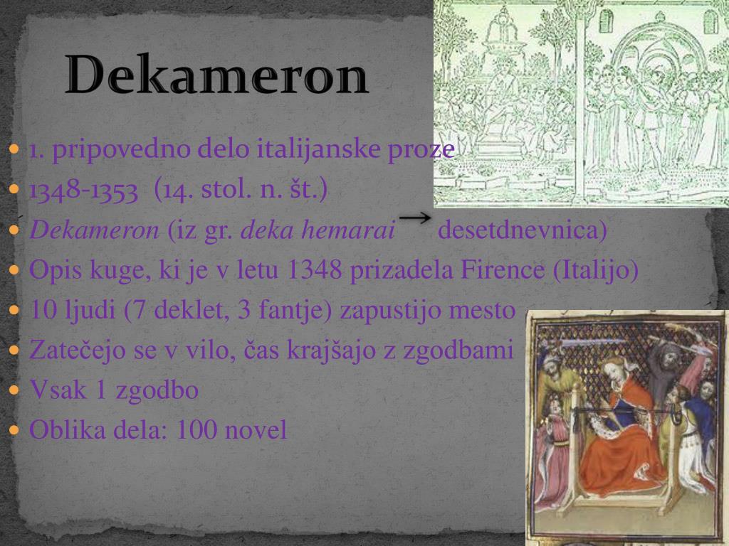 Dekameron • 1. pripovedno delo italijanske proze • 1348-1353 (14. stol. n. št.) • Dekameron (iz gr. deka hemarai desetdnevnica) • Opis kuge, ki je v letu 1348 prizadela Firence (Italijo) • 10 ljudi (7 deklet, 3 fantje) zapustijo mesto • Zatečejo se v vilo, čas krajšajo z zgodbami • Vsak 1 zgodbo • Oblika dela: 100 novel