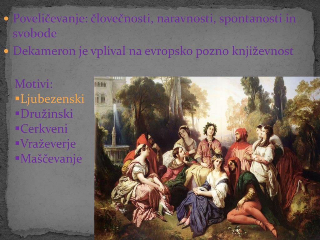 Poveličevanje: človečnosti, naravnosti, spontanosti in svobode • Dekameron je vplival na evropsko pozno književnost • Motivi: • Ljubezenski • Družinski • Cerkveni • Vraževerje • Maščevanje
