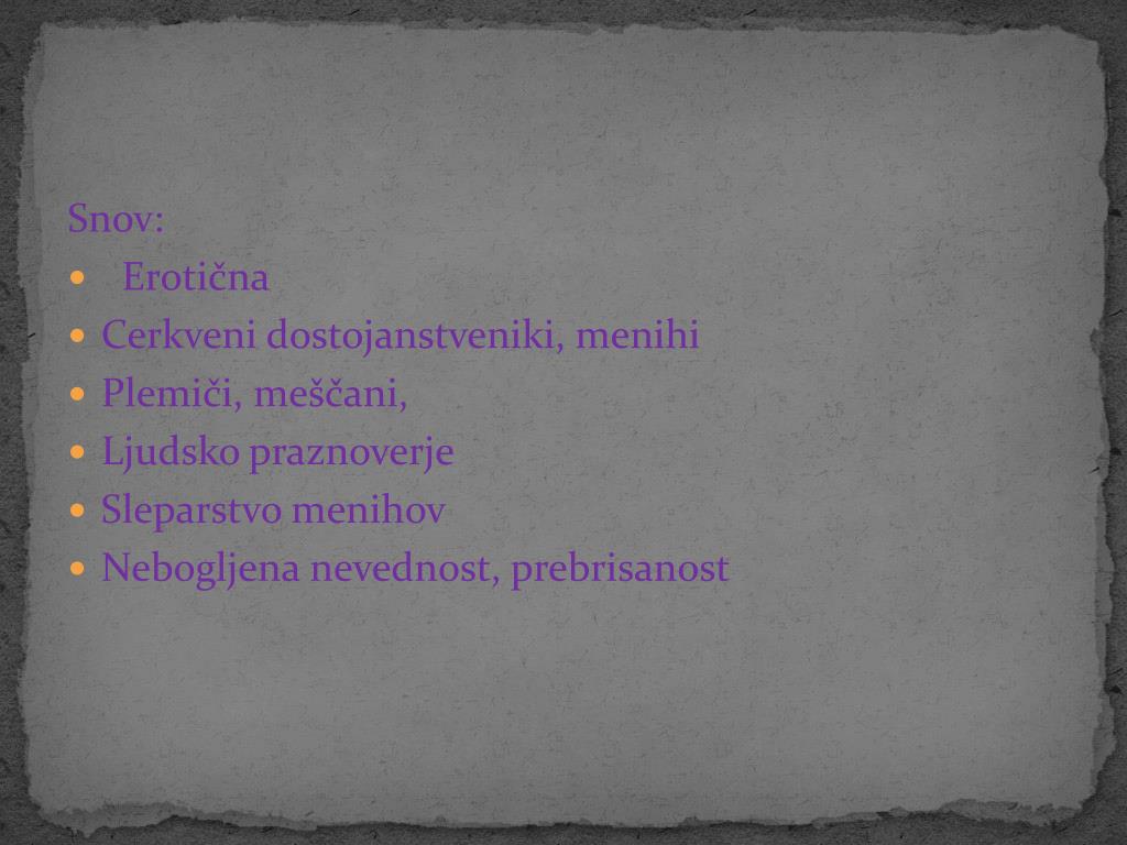 Snov: • Erotična • Cerkveni dostojanstveniki, menihi • Plemiči, meščani, • Ljudsko praznoverje • Sleparstvo menihov • Nebogljena nevednost, prebrisanost