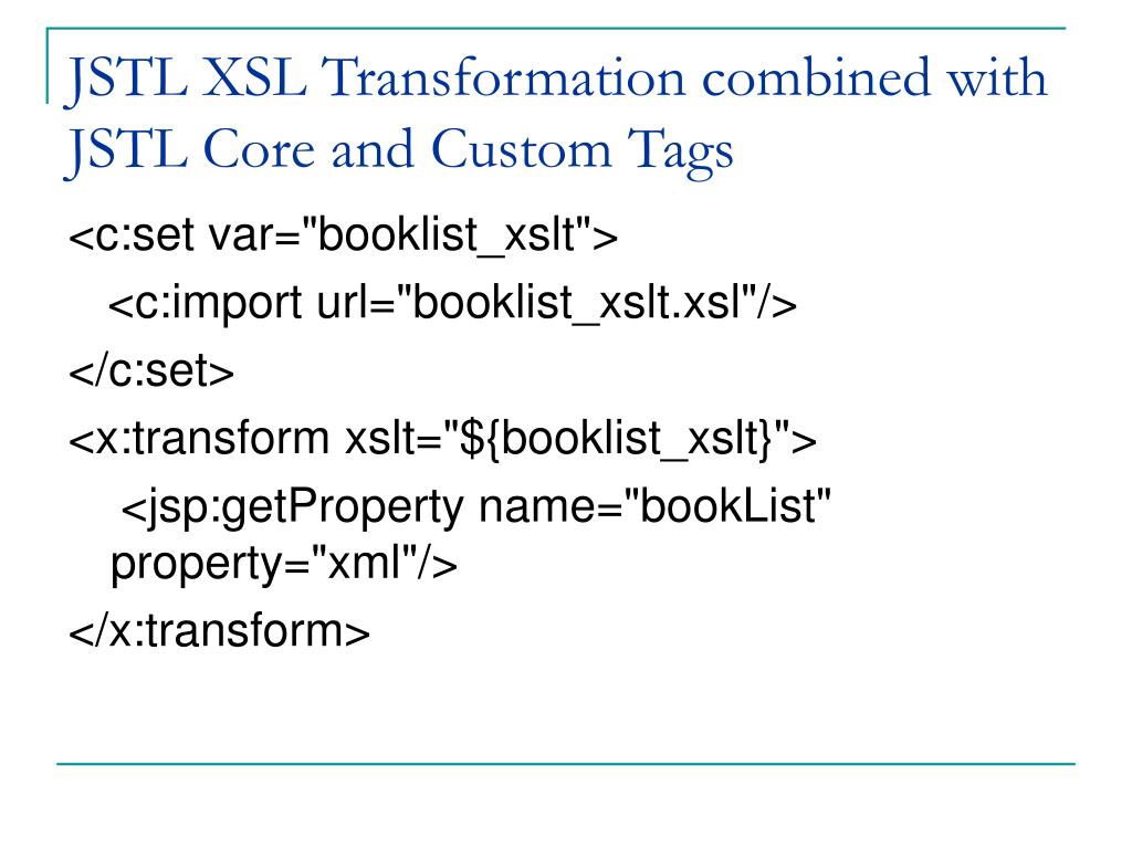 JSTL XSL Transformation combined with JSTL Core and Custom Tags <c:set var="booklist_xslt"> <c:import url="booklist_xslt.xsl"/> </c:set> <x:transform xslt="${booklist_xslt}"> <jsp:getProperty name="bookList" property="xml"/> </x:transform>