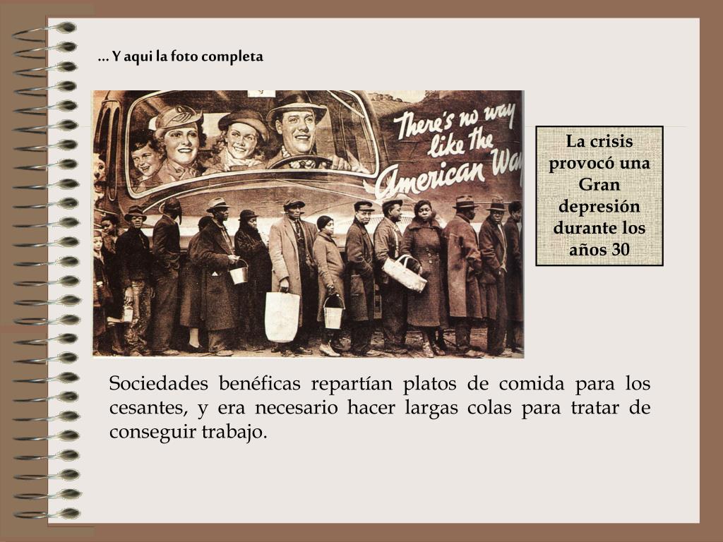 ... Y aqui la foto completa La crisis provocó una Gran depresión durante los años 30 Sociedades benéficas repartían platos de comida para los cesantes, y era necesario hacer largas colas para tratar de conseguir trabajo.
