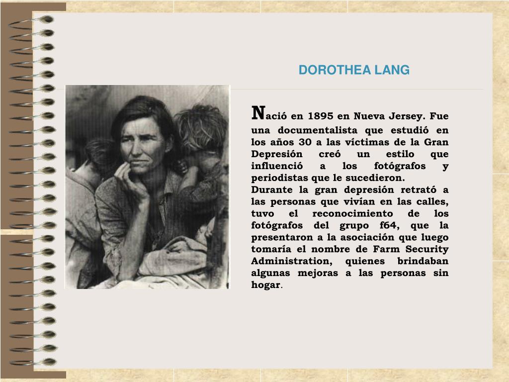 DOROTHEA LANG Nació en 1895 en Nueva Jersey. Fue una documentalista que estudió en los años 30 a las víctimas de la Gran Depresión creó un estilo que influenció a los fotógrafos y periodistas que le sucedieron. Durante la gran depresión retrató a las personas que vivían en las calles, tuvo el reconocimiento de los fotógrafos del grupo f64, que la presentaron a la asociación que luego tomaría el nombre de Farm Security Administration, quienes brindaban algunas mejoras a las personas sin hogar.