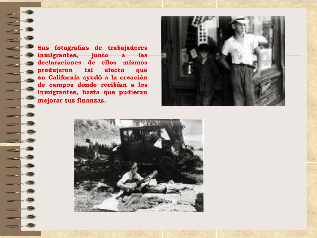 Sus fotografías de trabajadores inmigrantes, junto a las declaraciones de ellos mismos produjeron tal efecto que en California ayudó a la creación de campos donde recibían a los inmigrantes, hasta que pudieran mejorar sus finanzas.