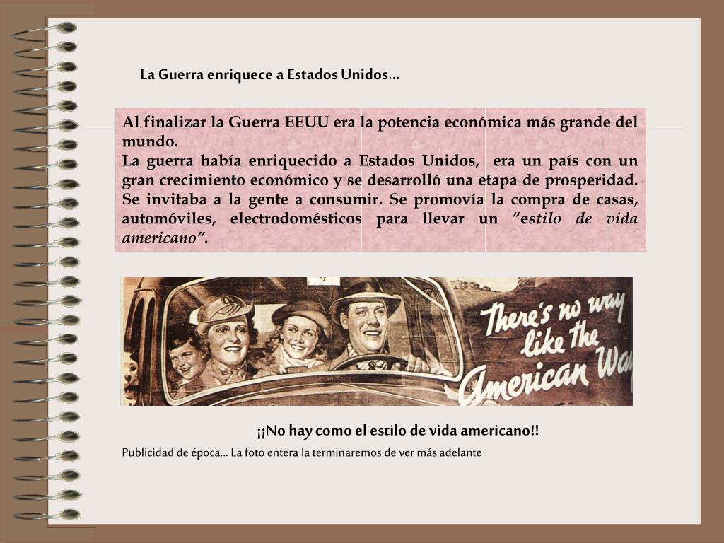 La Guerra enriquece a Estados Unidos... Al finalizar la Guerra EEUU era la potencia económica más grande del mundo. La guerra había enriquecido a Estados Unidos, era un país con un gran crecimiento económico y se desarrolló una etapa de prosperidad. Se invitaba a la gente a consumir. Se promovía la compra de casas, automóviles, electrodomésticos para llevar un “estilo de vida americano”. ¡¡No hay como el estilo de vida americano!! Publicidad de época... La foto entera la terminaremos de ver más adelante