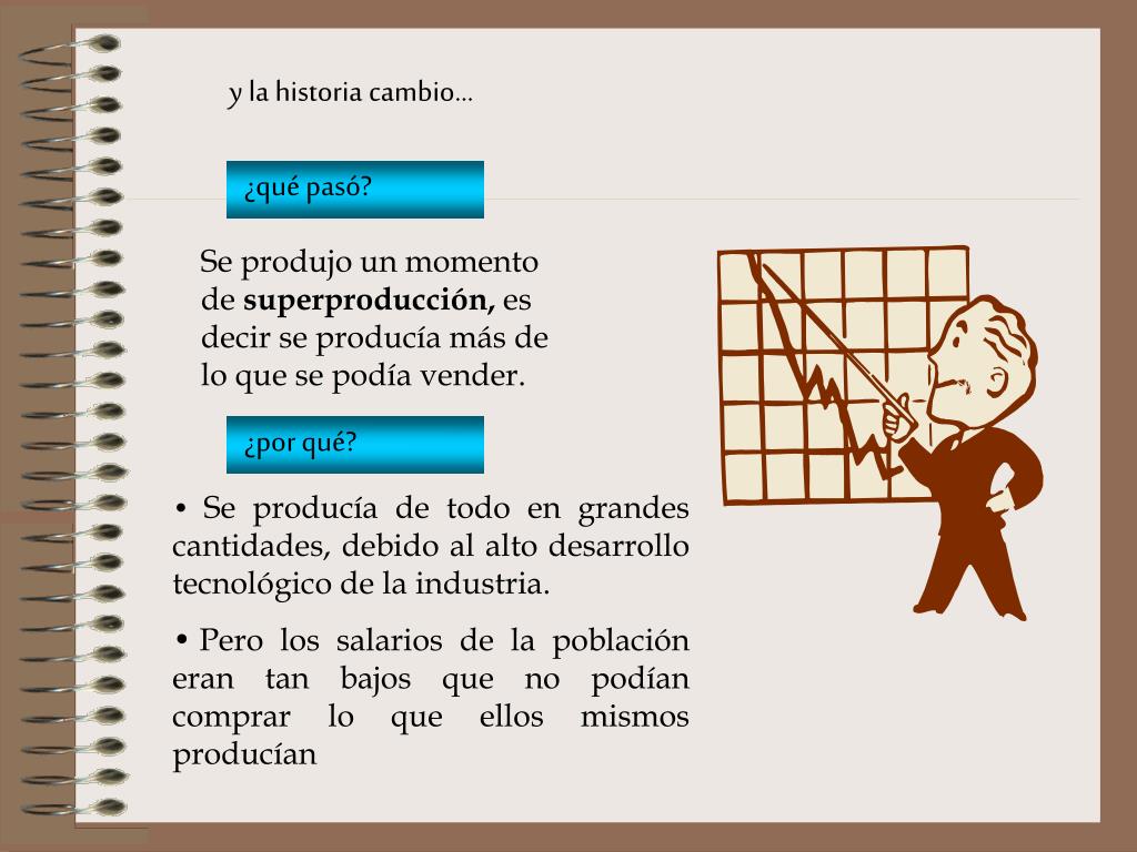 y la historia cambio... ¿qué pasó? Se produjo un momento de superproducción, es decir se producía más de lo que se podía vender. ¿por qué? • Se producía de todo en grandes cantidades, debido al alto desarrollo tecnológico de la industria. • Pero los salarios de la población eran tan bajos que no podían comprar lo que ellos mismos producían