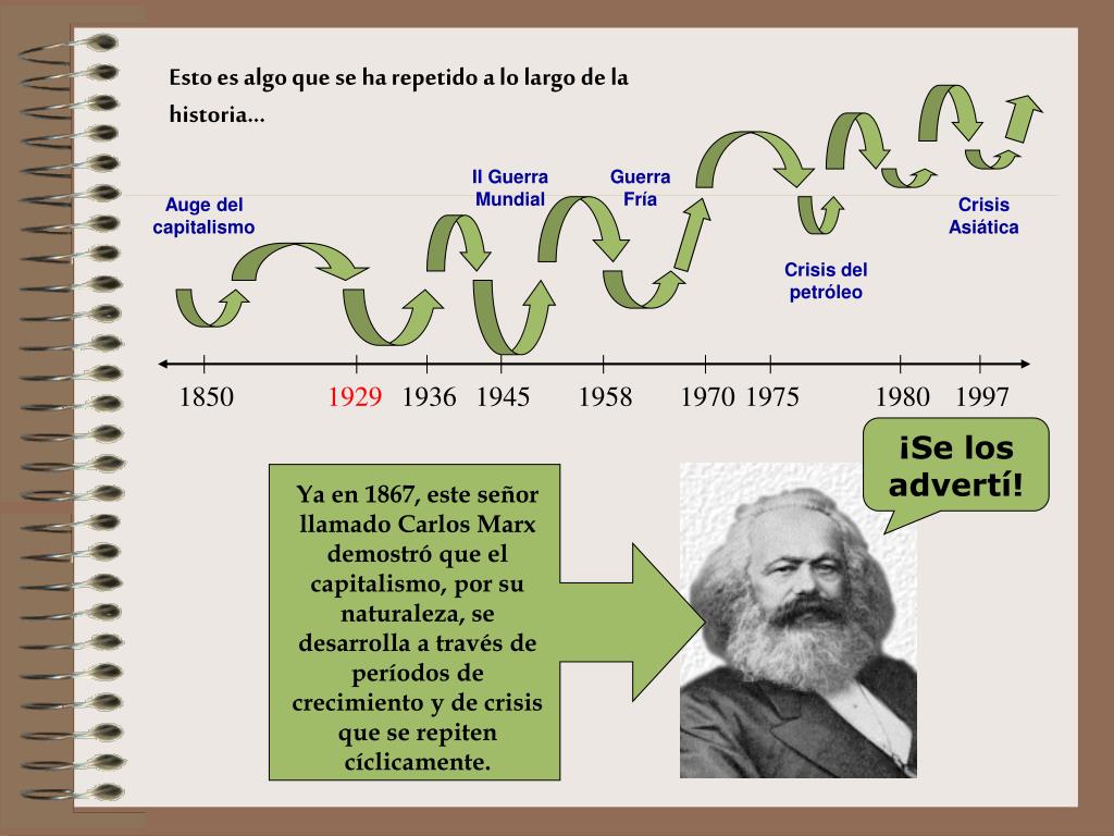 II Guerra Mundial Guerra Fría Auge del capitalismo Crisis Asiática Crisis del petróleo 1850 1929 1936 1945 1958 1970 1975 1980 1997 Ya en 1867, este señor llamado Carlos Marx demostró que el capitalismo, por su naturaleza, se desarrolla a través de períodos de crecimiento y de crisis que se repiten cíclicamente. Esto es algo que se ha repetido a lo largo de la historia... ¡Se los advertí!