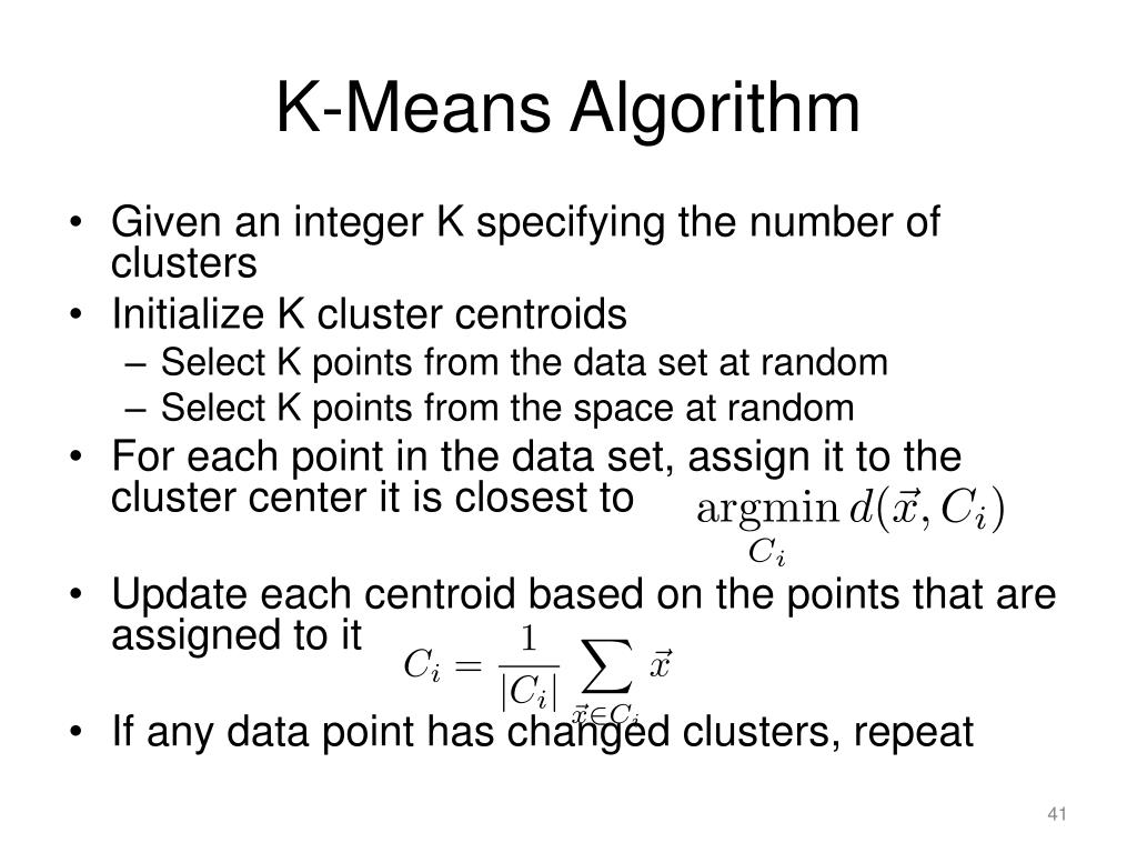 K-Means Algorithm • Given an integer K specifying the number of clusters • Initialize K cluster centroids • Select K points from the data set at random • Select K points from the space at random • For each point in the data set, assign it to the cluster center it is closest to • Update each centroid based on the points that are assigned to it • If any data point has changed clusters, repeat