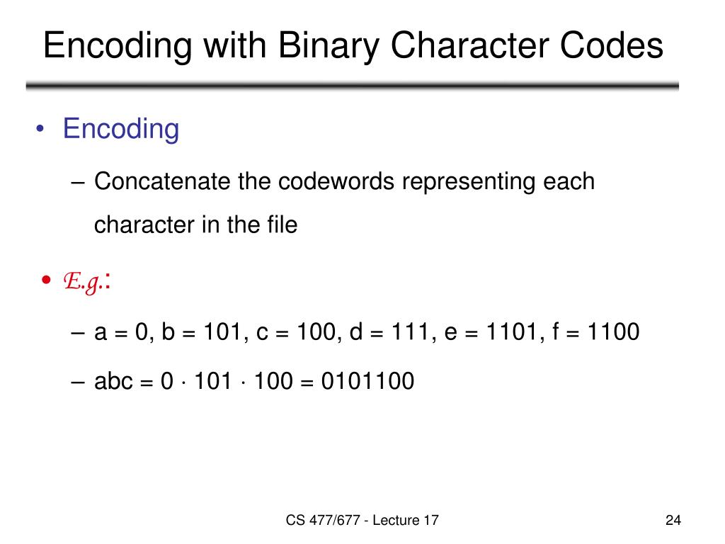 Encoding with Binary Character Codes • Encoding • Concatenate the codewords representing each character in the file • E.g.: • a = 0, b = 101, c = 100, d = 111, e = 1101, f = 1100 • abc = 0 101 100 = 0101100 CS 477/677 - Lecture 17