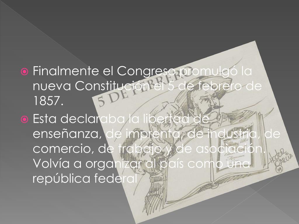 Finalmente el Congreso promulgó la nueva Constitución el 5 de febrero de 1857. • Esta declaraba la libertad de enseñanza, de imprenta, de industria, de comercio, de trabajo y de asociación. Volvía a organizar al país como una república federal