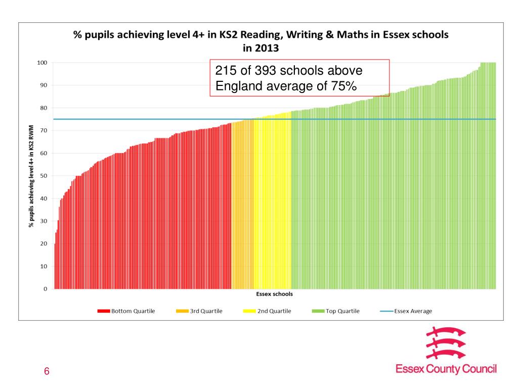 In Essex, we have set ambitions: • Relative performance to be in the overall top quartile • Every child to go to a school ranked as ‘good’ • Vulnerable children to receive a quality education • Parents to have a wide choice of schools • School leavers to have effective routes into training and employment