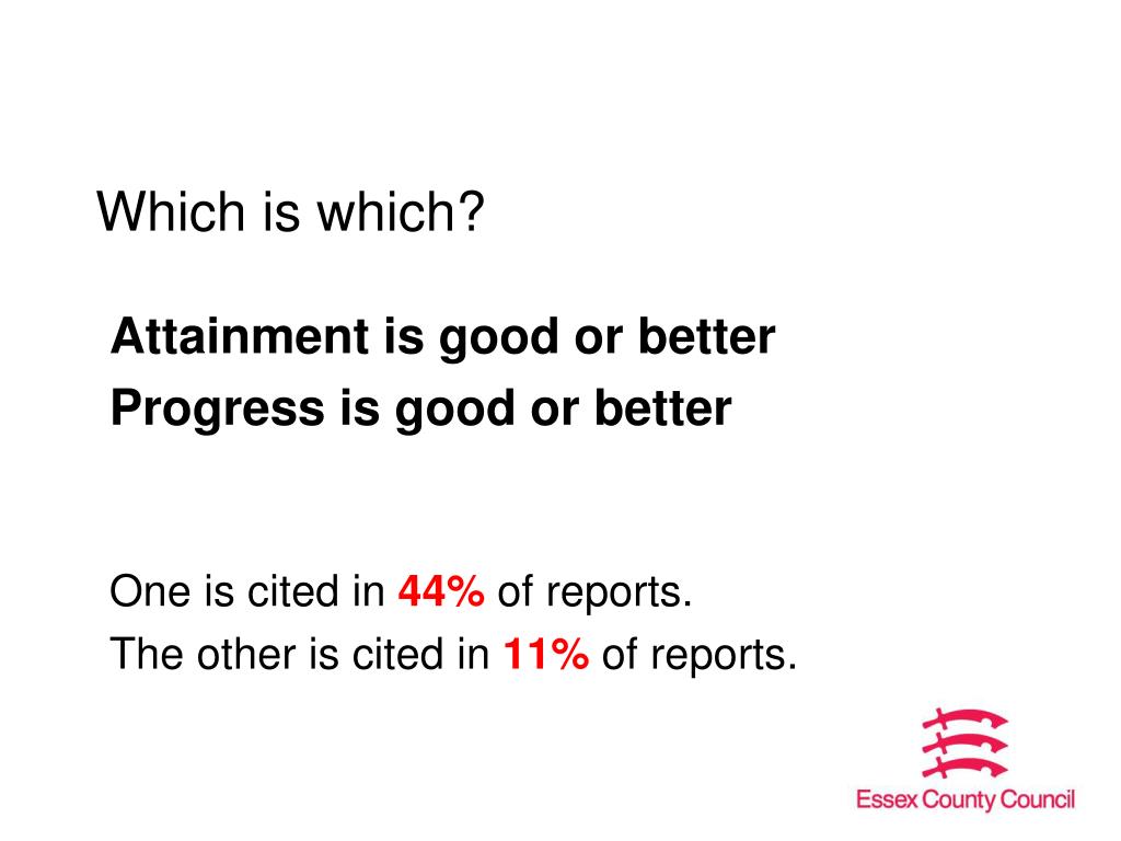Which is which? Attainment is good or better Progress is good or better One is cited in 44% of reports. The other is cited in 11% of reports.
