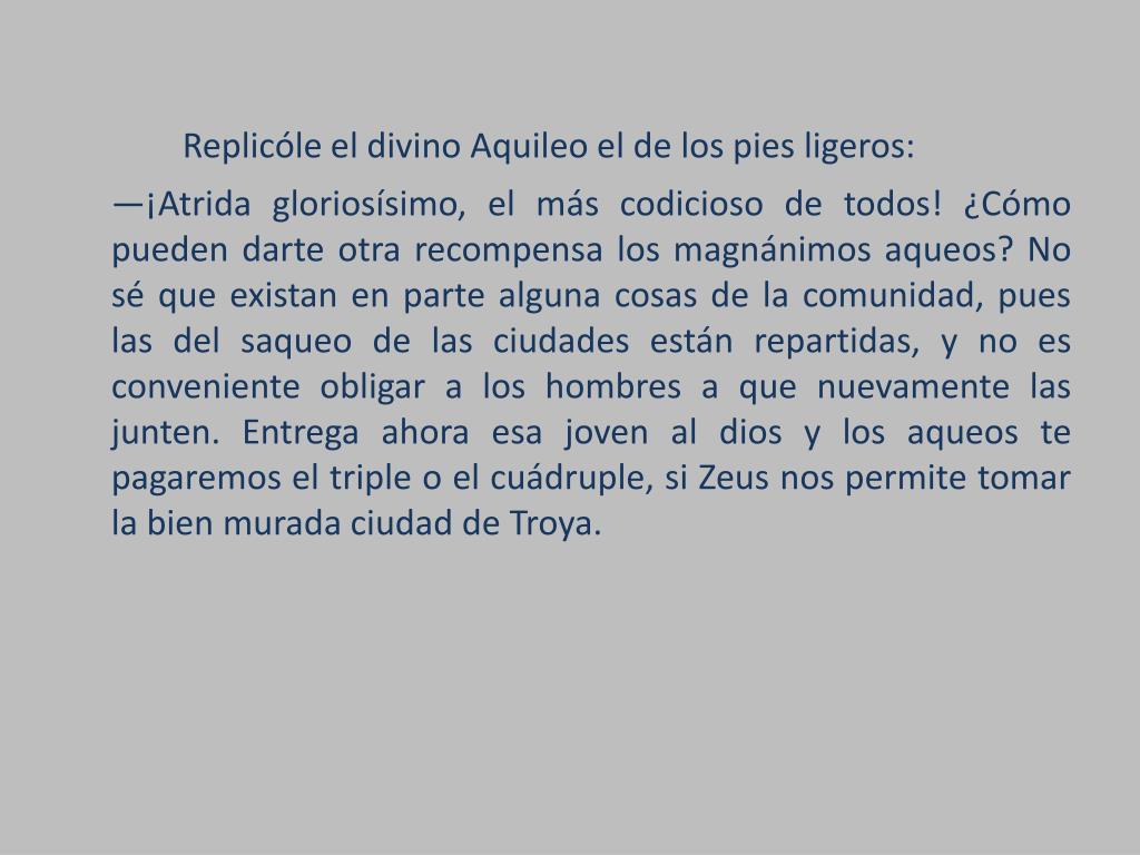 Replicóle el divino Aquileo el de los pies ligeros: —¡Atrida gloriosísimo, el más codicioso de todos! ¿Cómo pueden darte otra recompensa los magnánimos aqueos? No sé que existan en parte alguna cosas de la comunidad, pues las del saqueo de las ciudades están repartidas, y no es conveniente obligar a los hombres a que nuevamente las junten. Entrega ahora esa joven al dios y los aqueos te pagaremos el triple o el cuádruple, si Zeus nos permite tomar la bien murada ciudad de Troya.