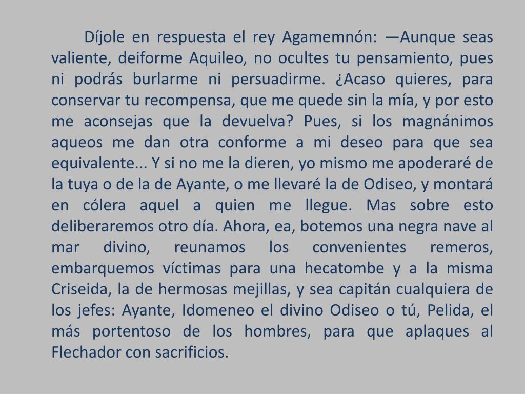 Díjole en respuesta el rey Agamemnón: —Aunque seas valiente, deiforme Aquileo, no ocultes tu pensamiento, pues ni podrás burlarme ni persuadirme. ¿Acaso quieres, para conservar tu recompensa, que me quede sin la mía, y por esto me aconsejas que la devuelva? Pues, si los magnánimos aqueos me dan otra conforme a mi deseo para que sea equivalente... Y si no me la dieren, yo mismo me apoderaré de la tuya o de la de Ayante, o me llevaré la de Odiseo, y montará en cólera aquel a quien me llegue. Mas sobre esto deliberaremos otro día. Ahora, ea, botemos una negra nave al mar divino, reunamos los convenientes remeros, embarquemos víctimas para una hecatombe y a la misma Criseida, la de hermosas mejillas, y sea capitán cualquiera de los jefes: Ayante, Idomeneo el divino Odiseo o tú, Pelida, el más portentoso de los hombres, para que aplaques al Flechador con sacrificios.