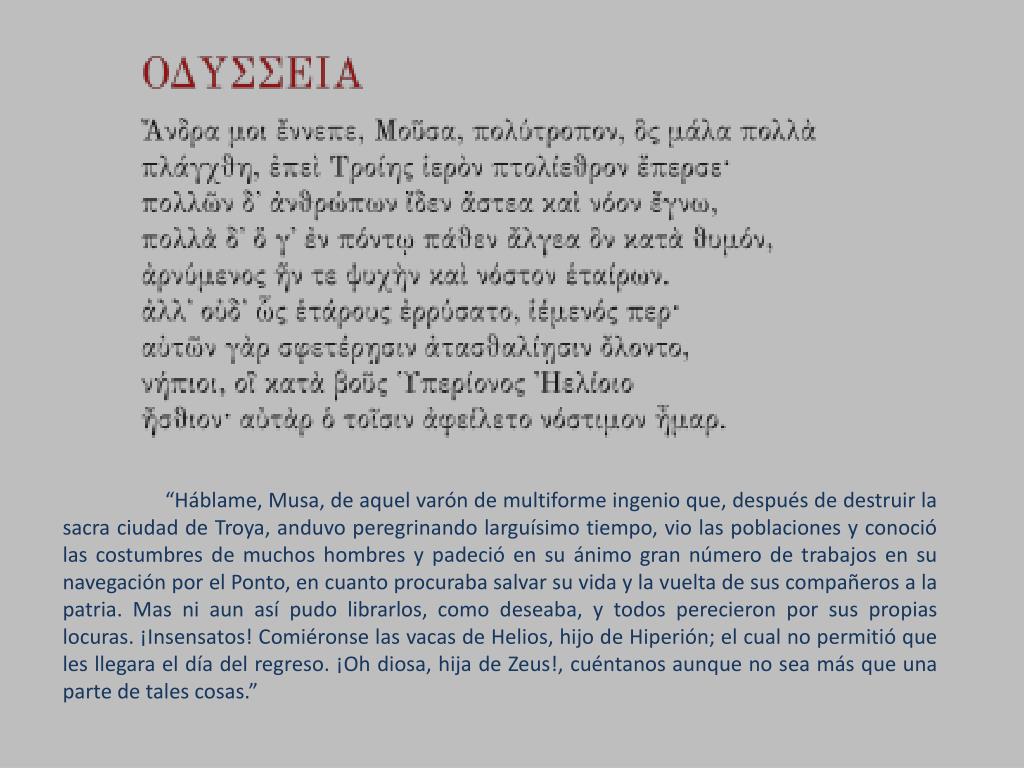 “Háblame, Musa, de aquel varón de multiforme ingenio que, después de destruir la sacra ciudad de Troya, anduvo peregrinando larguísimo tiempo, vio las poblaciones y conoció las costumbres de muchos hombres y padeció en su ánimo gran número de trabajos en su navegación por el Ponto, en cuanto procuraba salvar su vida y la vuelta de sus compañeros a la patria. Mas ni aun así pudo librarlos, como deseaba, y todos perecieron por sus propias locuras. ¡Insensatos! Comiéronse las vacas de Helios, hijo de Hiperión; el cual no permitió que les llegara el día del regreso. ¡Oh diosa, hija de Zeus!, cuéntanos aunque no sea más que una parte de tales cosas.”