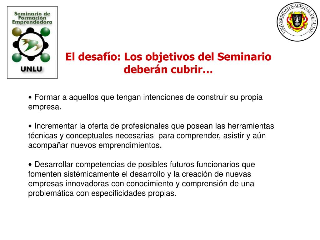 El desafío: Los objetivos del Seminario deberán cubrir… • Formar a aquellos que tengan intenciones de construir su propia empresa. • Incrementar la oferta de profesionales que posean las herramientas técnicas y conceptuales necesarias para comprender, asistir y aún acompañar nuevos emprendimientos. • Desarrollar competencias de posibles futuros funcionarios que fomenten sistémicamente el desarrollo y la creación de nuevas empresas innovadoras con conocimiento y comprensión de una problemática con especificidades propias.