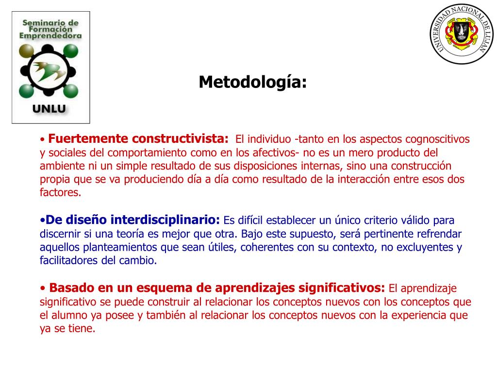 Metodología: • Fuertemente constructivista:El individuo -tanto en los aspectos cognoscitivos y sociales del comportamiento como en los afectivos- no es un mero producto del ambiente ni un simple resultado de sus disposiciones internas, sino una construcción propia que se va produciendo día a día como resultado de la interacción entre esos dos factores. • De diseño interdisciplinario:Es difícil establecer un único criterio válido para discernir si una teoría es mejor que otra. Bajo este supuesto, será pertinente refrendar aquellos planteamientos que sean útiles, coherentes con su contexto, no excluyentes y facilitadores del cambio. • Basado en un esquema de aprendizajes significativos:El aprendizaje significativo se puede construir al relacionar los conceptos nuevos con los conceptos que el alumno ya posee y también al relacionar los conceptos nuevos con la experiencia que ya se tiene.