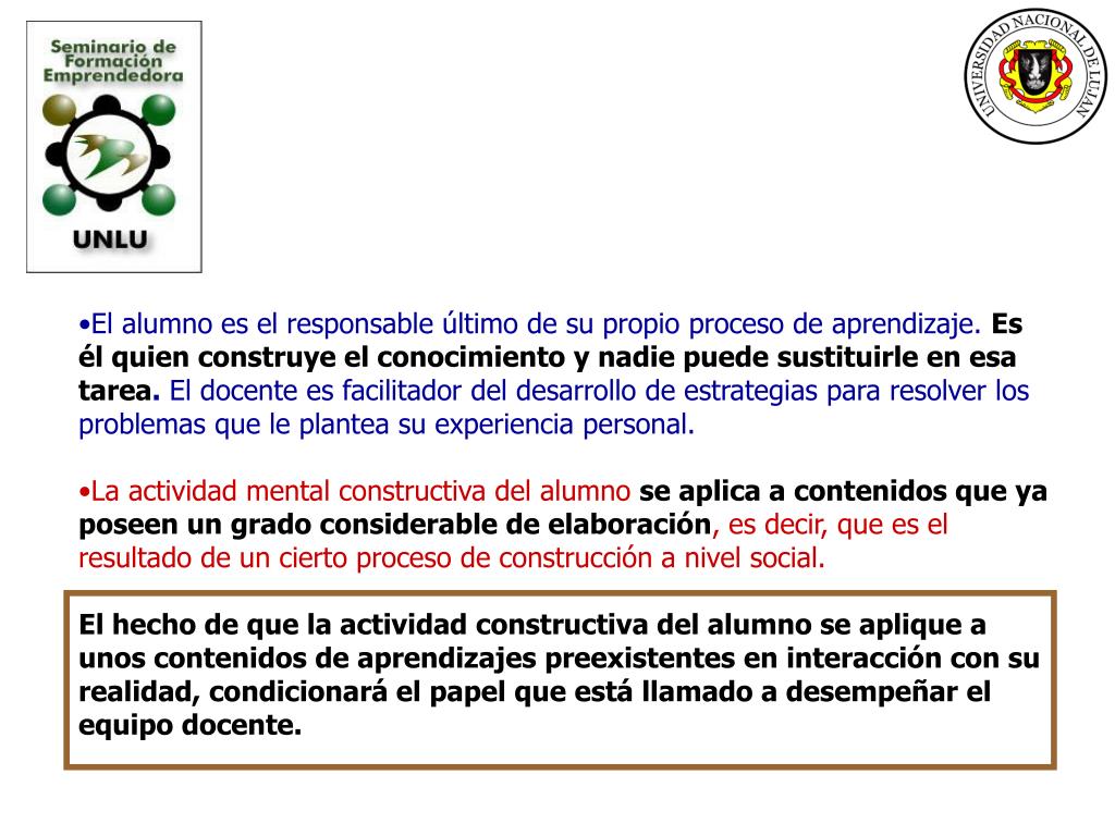 El alumno es el responsable último de su propio proceso de aprendizaje. Es él quien construye el conocimiento y nadie puede sustituirle en esa tarea. El docente es facilitador del desarrollo de estrategias para resolver los problemas que le plantea su experiencia personal. • La actividad mental constructiva del alumno se aplica a contenidos que ya poseen un grado considerable de elaboración, es decir, que es el resultado de un cierto proceso de construcción a nivel social. • El hecho de que la actividad constructiva del alumno se aplique a unos contenidos de aprendizajes preexistentes en interacción con su realidad, condicionará el papel que está llamado a desempeñar el equipo docente.