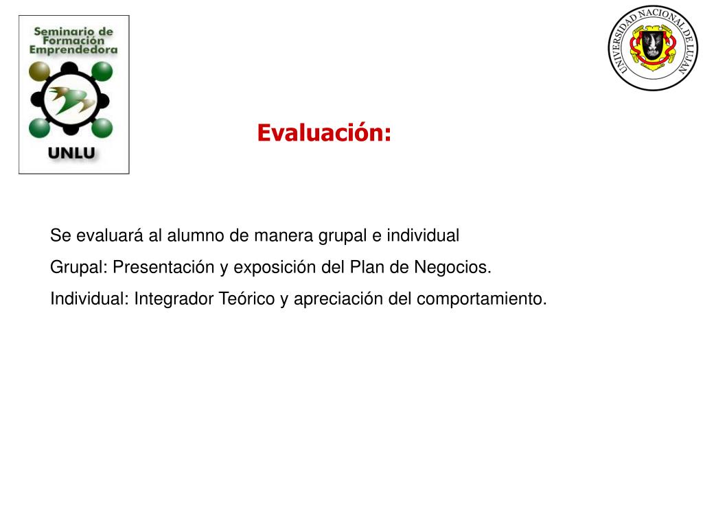 Evaluación: Se evaluará al alumno de manera grupal e individual Grupal: Presentación y exposición del Plan de Negocios. Individual: Integrador Teórico y apreciación del comportamiento.
