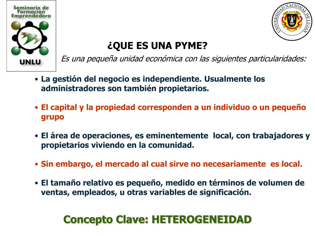 ¿QUE ES UNA PYME? Es una pequeña unidad económica con las siguientes particularidades: • La gestión del negocio es independiente. Usualmente los administradores son también propietarios. • El capital y la propiedad corresponden a un individuo o un pequeño grupo • El área de operaciones, es eminentemente local, con trabajadores y propietarios viviendo en la comunidad. • Sin embargo, el mercado al cual sirve no necesariamente es local. • El tamaño relativo es pequeño, medido en términos de volumen de ventas, empleados, u otras variables de significación. Concepto Clave: HETEROGENEIDAD